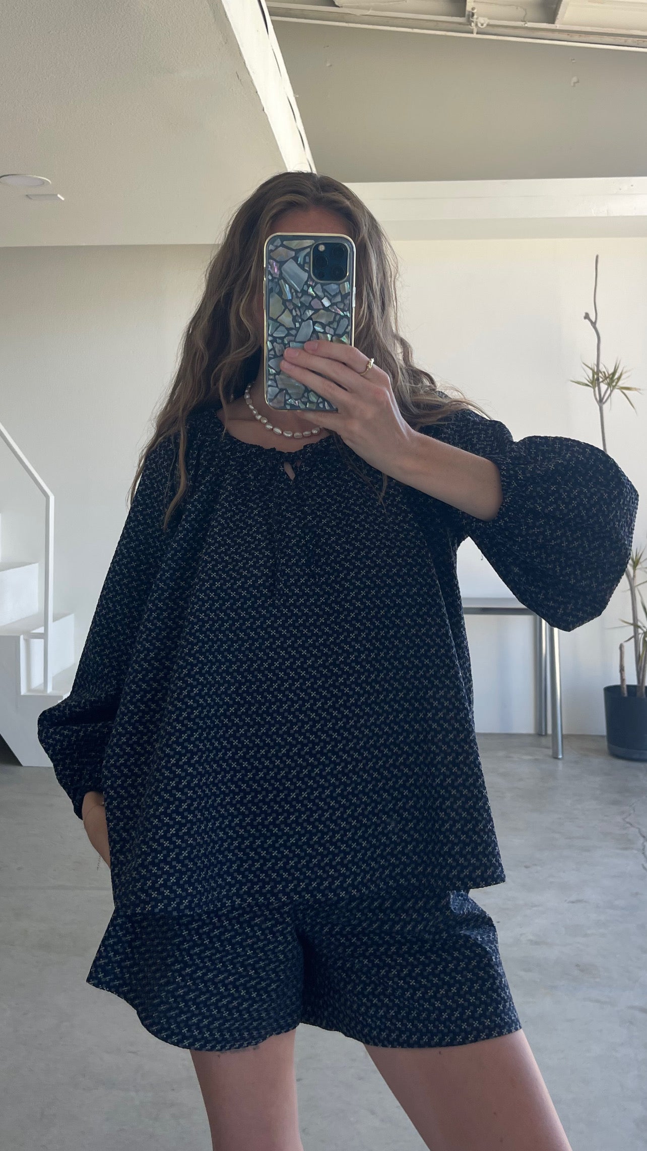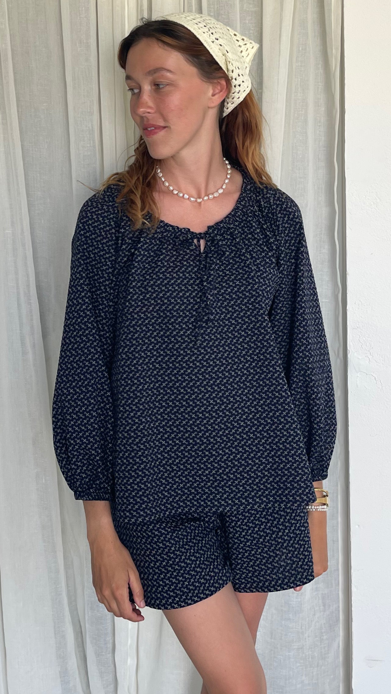 Introducing our Bardot Blouse. With its romantic and effortless silhouette, this timeless piece is a closet staple. Features blouson sleeves with the sweetest tie at the neckline (the neckline tie is a decorative piece, so the neckline will always retain its shape). Made with 100% organic cotton seersucker in navy with a vintage inspired print. Soft, lightweight, and perfect for all seasons.