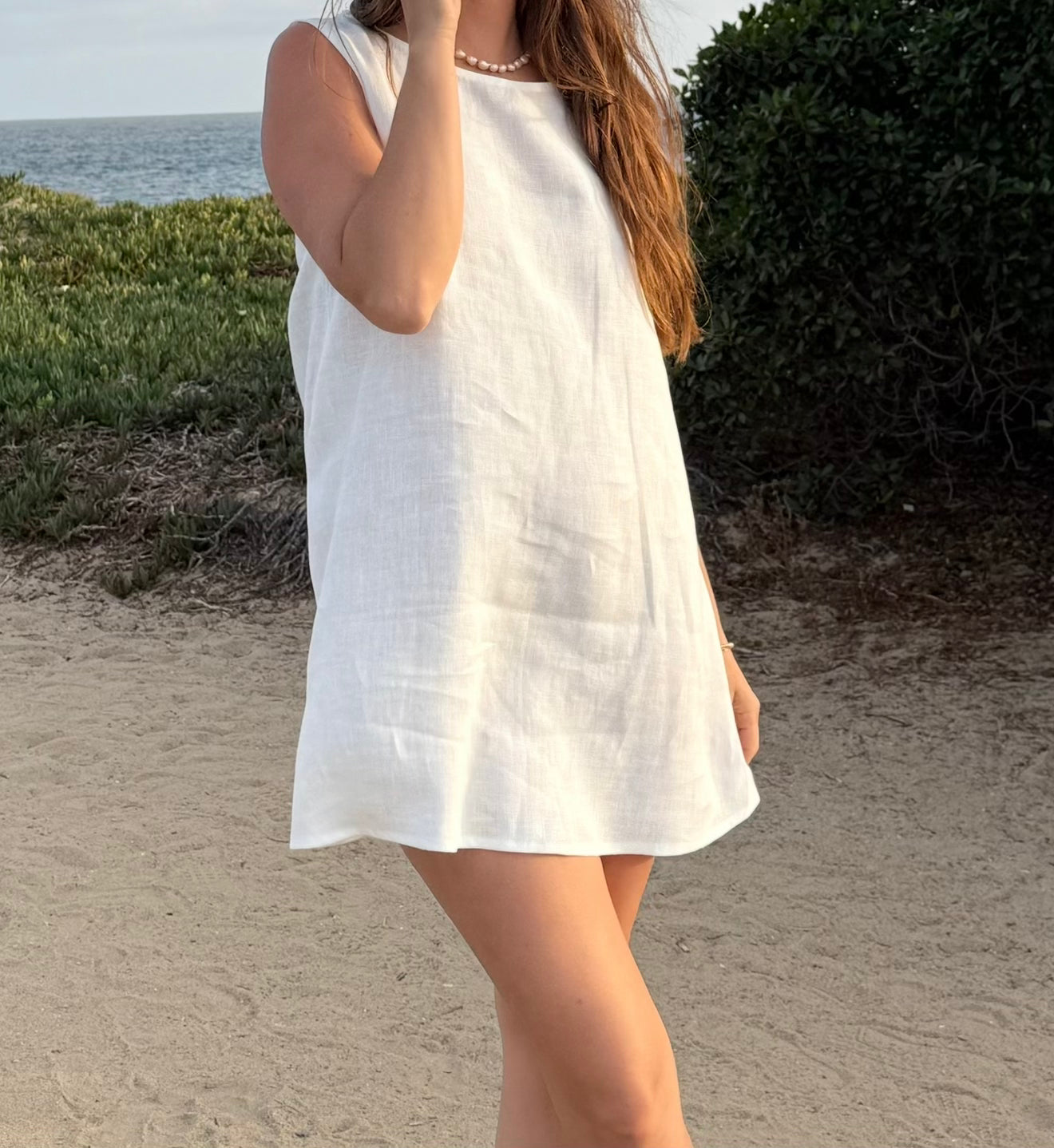 Introducing the Birkin Dress. An effortless, vintage-inspired dress with an easy silhouette crafted from 100 % super soft white linen. Features a simple, relaxed shape and mini length that adds just the right touch of je ne sais quoi. Inspired by the '60s countryside summers and one of our favorite muses Jane Birkin, this dress is a sunshine staple you'll reach for again and again.