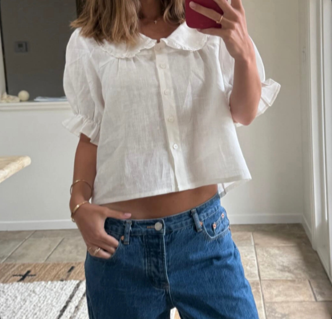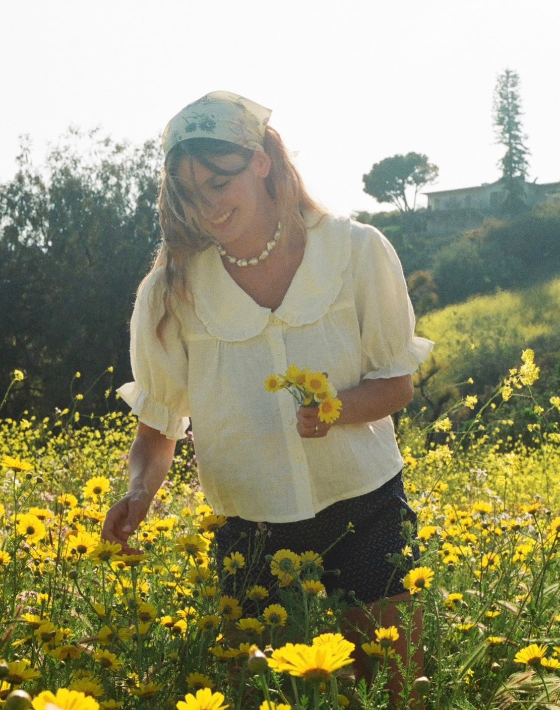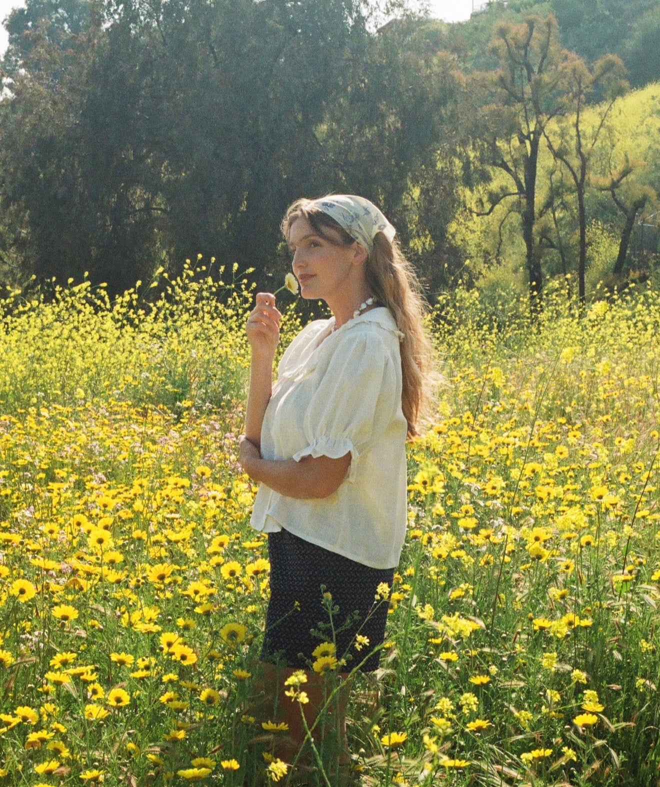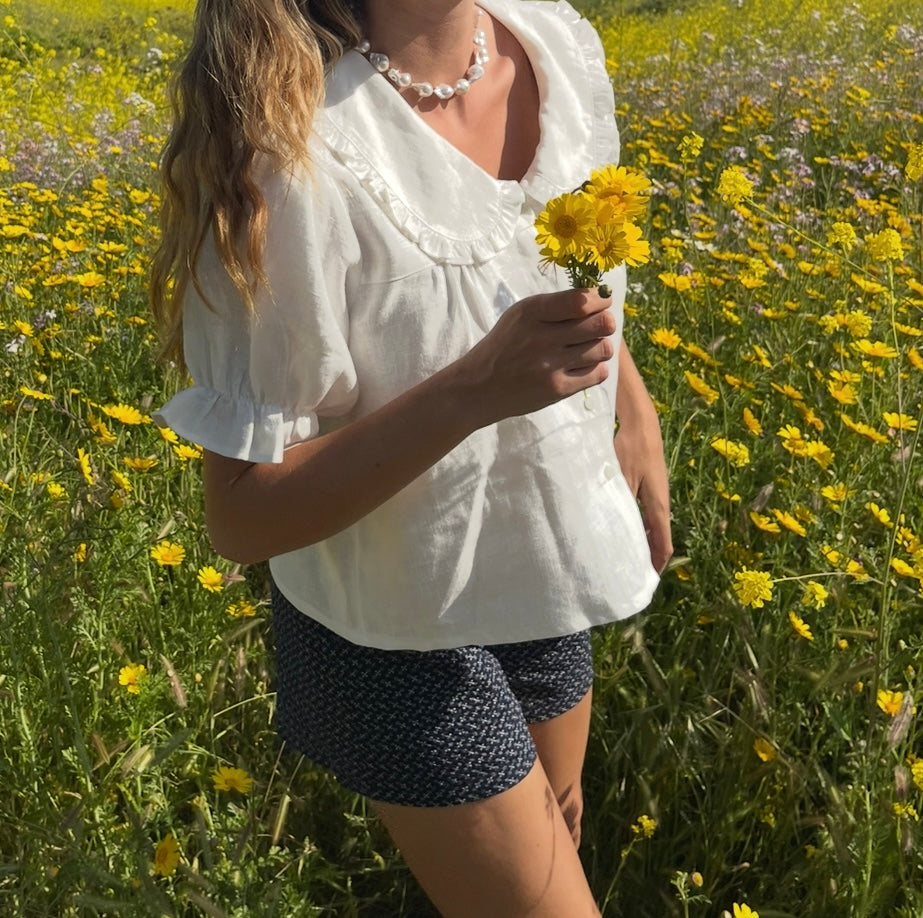 Made from 100% super soft linen, the Chérie blouse features romantic puff sleeves, a ruffled collar, and ethically sourced freshwater mother of pearl shell buttons. Handcrafted with care by our local seamstress here in Orange County, CA.