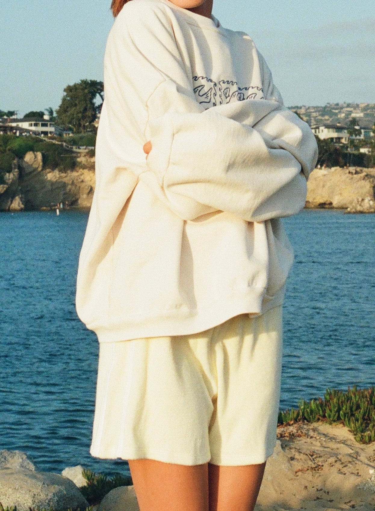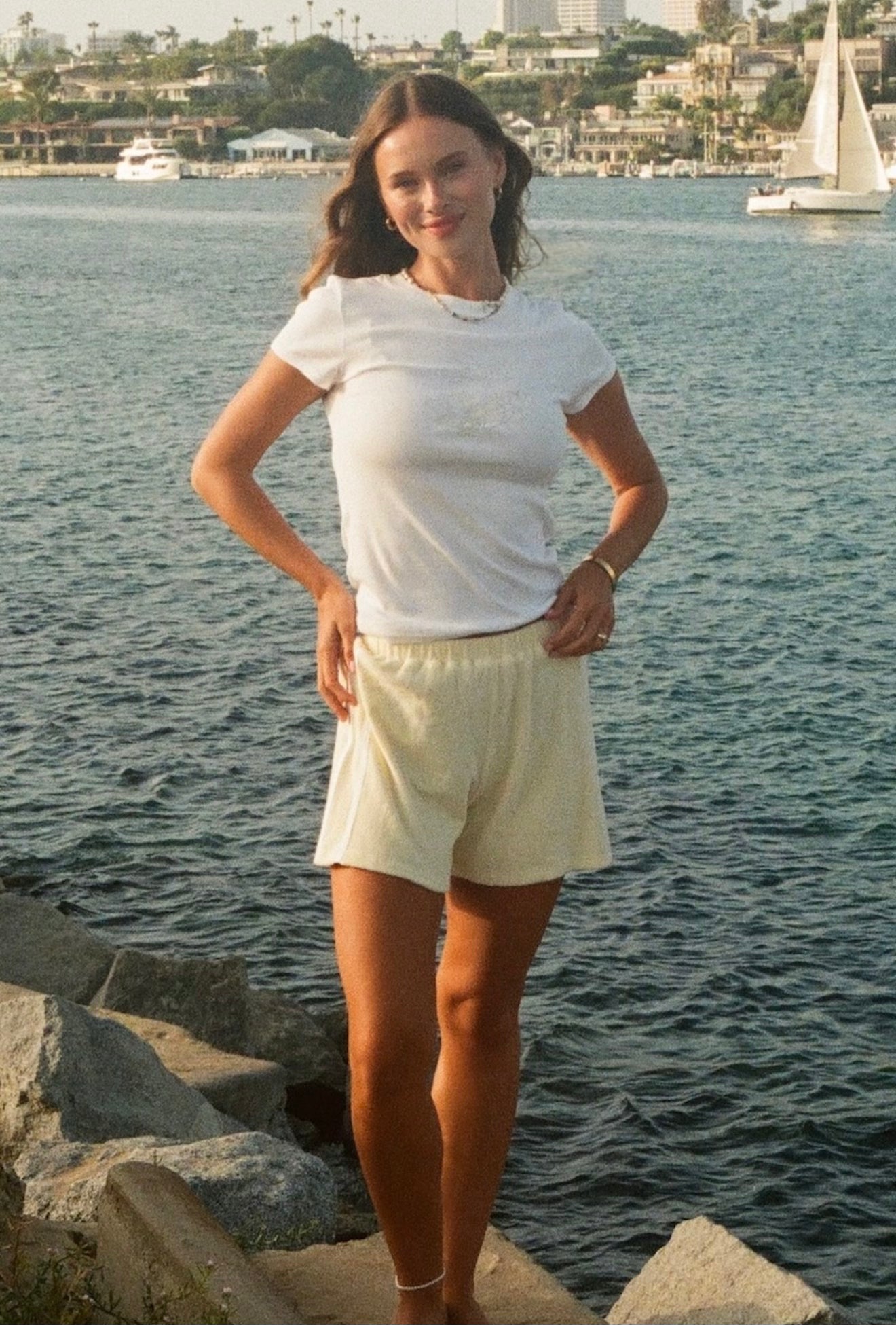 Fabric: 100% organic terry cloth cotton (pre-shrunk), knit in LA with AZO-free dyes. Features a relaxed fit and double stripe detail on each side. Created in a beautiful butter yellow color<3.