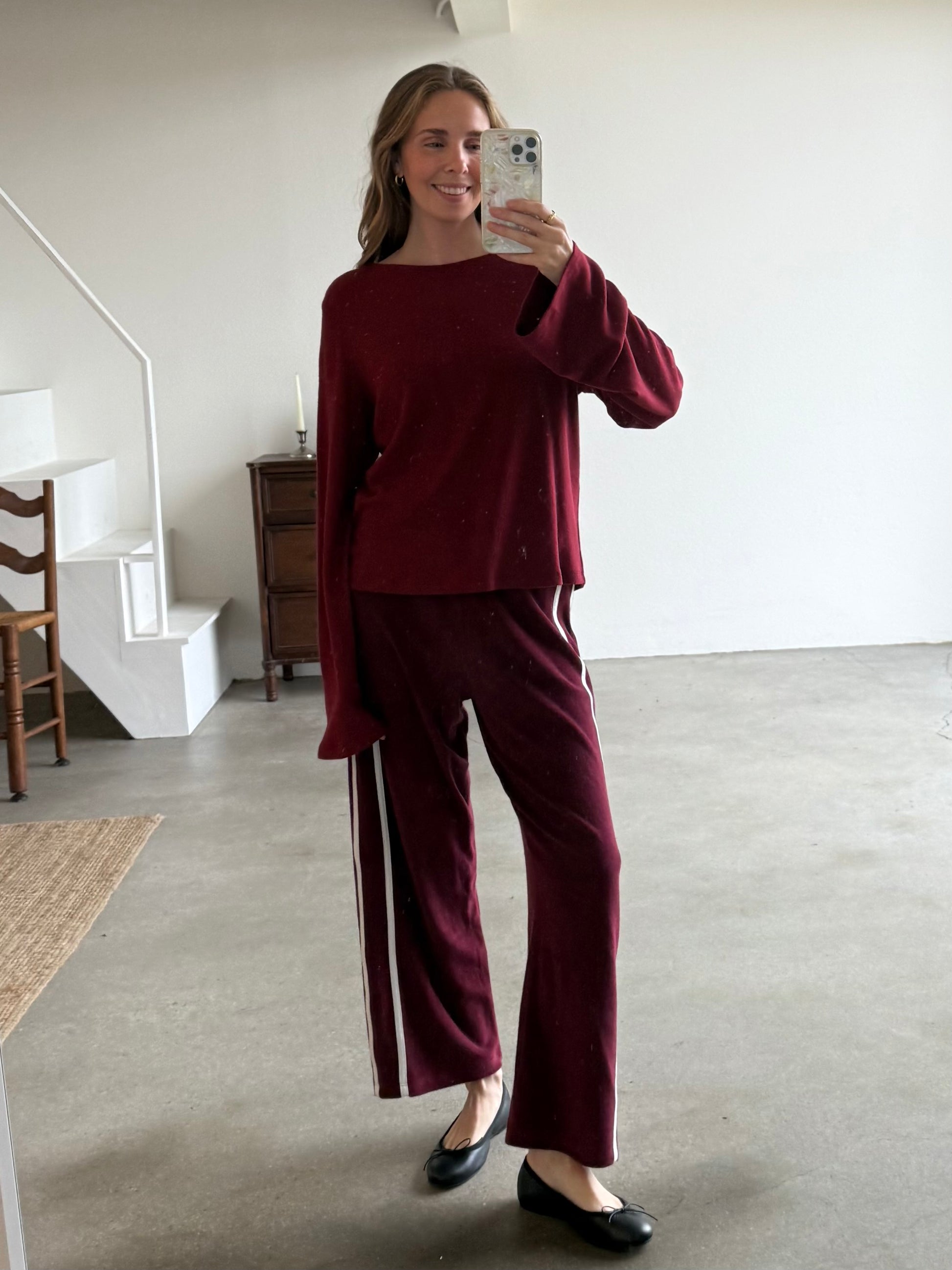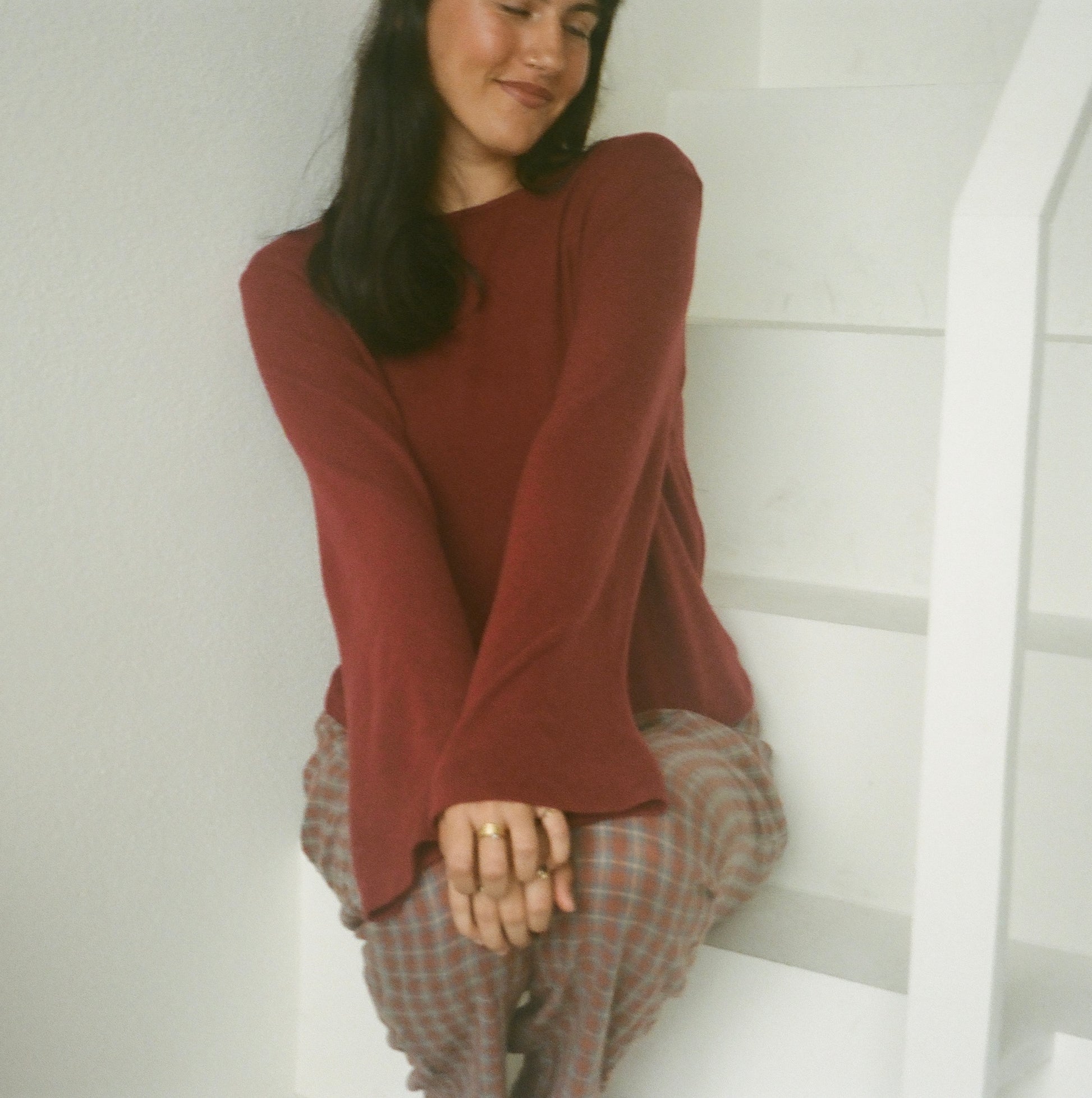 Introducing the Sabine Sweater in Bordeaux. Made from an organic cotton/tencel blend that’s locally knitted and dyed in LA, she’s soft, cozy, and chic with a beautifully fluid drape. Thoughtful details include a slight boatneck silhouette and bell sleeves. Romantic, feminine, and timeless, the Sabine sweater is a perfect addition to your capsule wardrobe.
