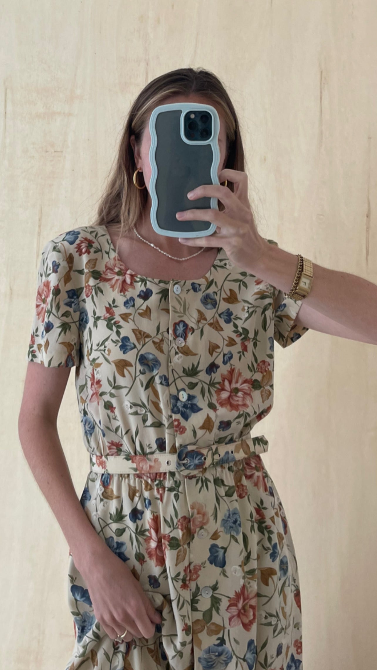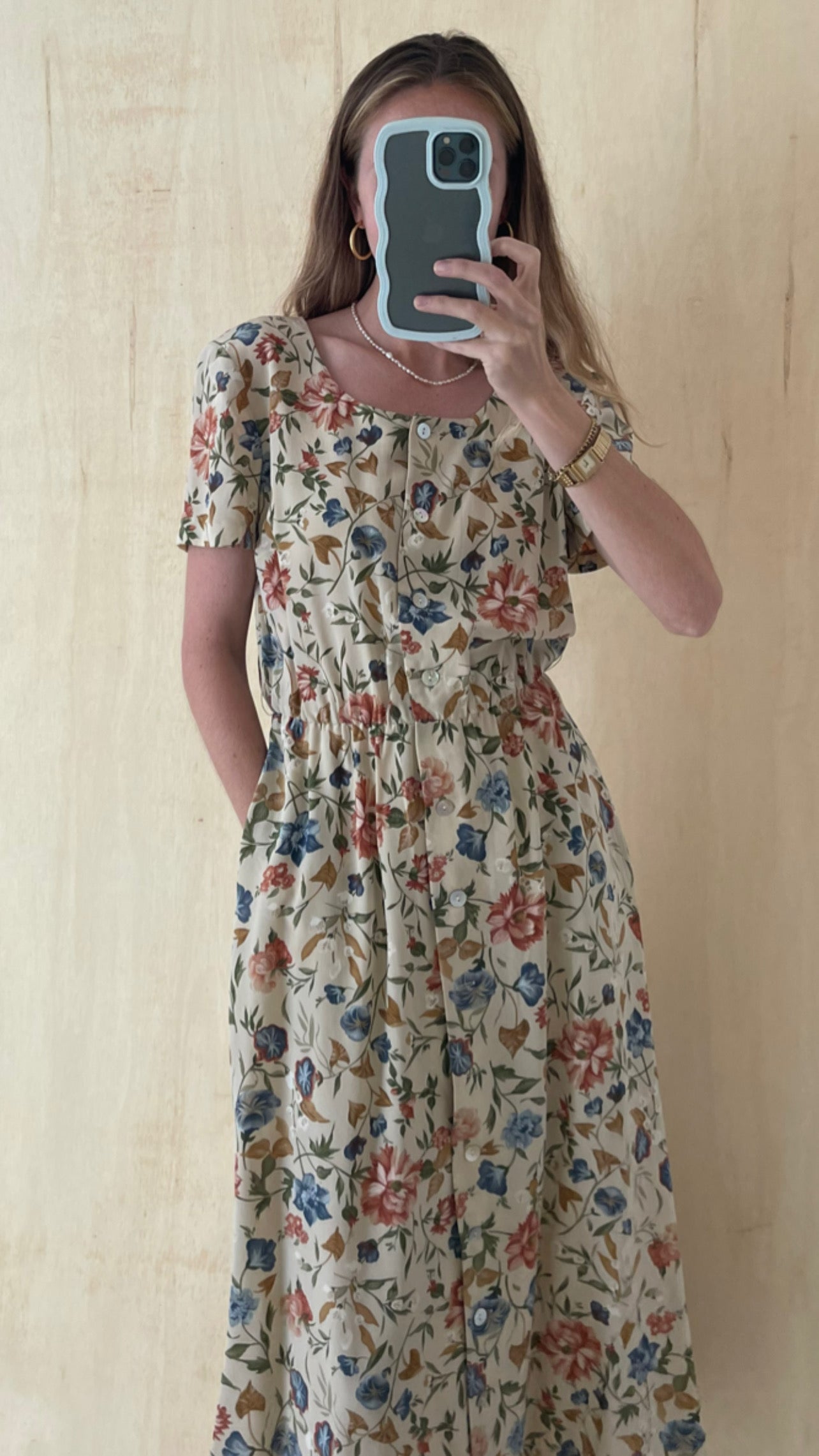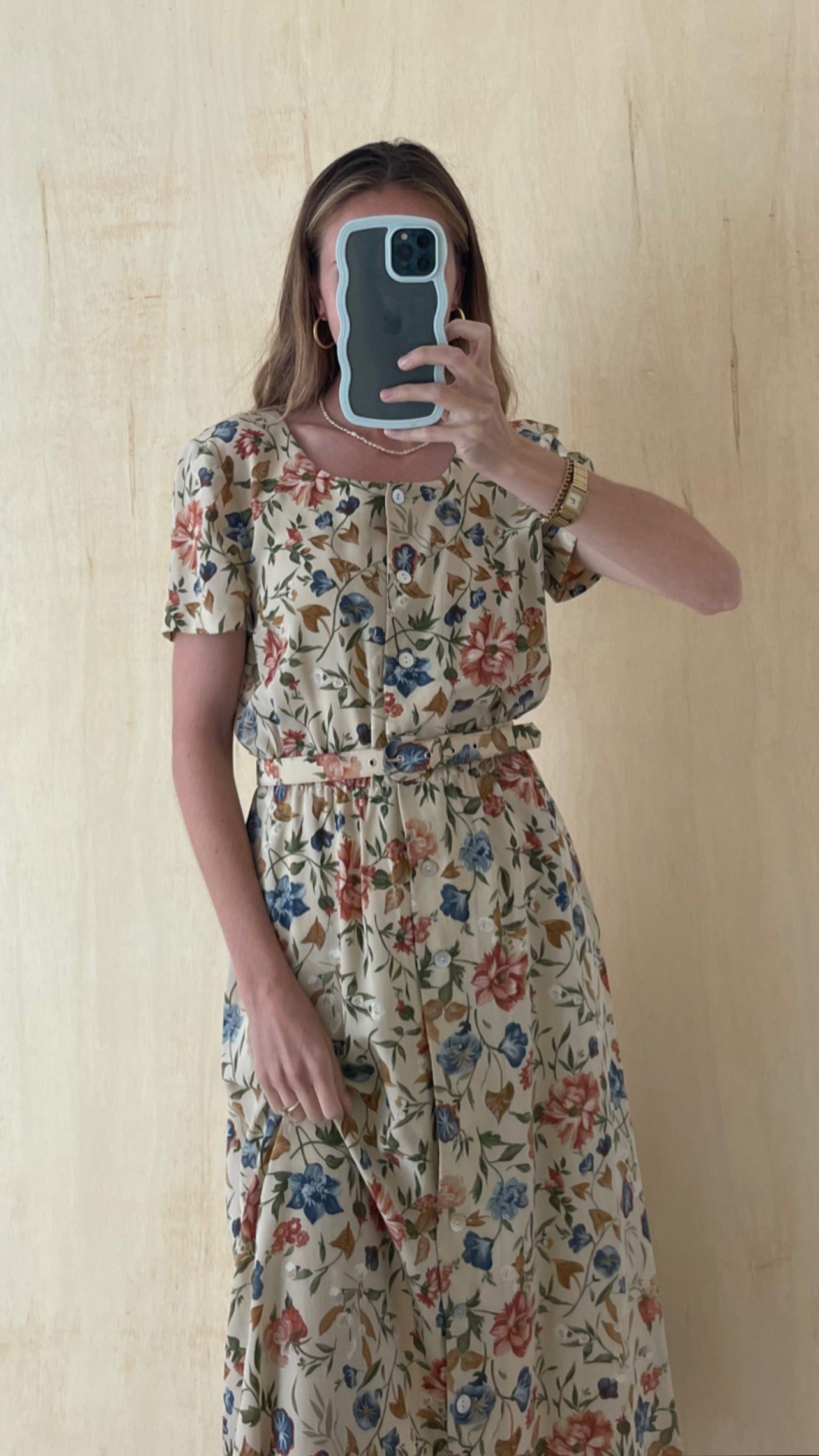 The sweetest vintage fall-toned floral maxi dress. Has beautiful mother of pearl buttons and is made from 100% silk. Would be so cute layered for fall. Comes with a matching belt and is cinched at the waist so you can wear it with the belt or without as seen in the pictures.